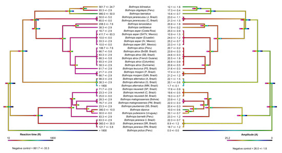 Phylogenetic trees were initially produced using TimeTree (TimeTree.org) and exported to Mesquite (version 3.61), where additional branches for localities and certain species were made manually. TimeTree collates data from published studies to produce a phylogeny from the specified genus which, in this study, is Bothrops. The resulting tree was missing two of the species analysed in the study: Bothrops barnetti and B. oligolepis. The missing species were manually added to the tree and their branch lengths estimated, based on phylogenies from [71,72,73]. The Mesquite tree file (.phy file) is available in the Supplementary Materials (Supplementary File S2). The tree was then imported into the statistical software R (version 3.6.1) using the APE package [95]. The contMAP function of the phytools package [96] was used to estimate ancestral states, using maximum likelihood, and to visually represent the presented trait over the tree. Four trees were produced: a tree produced from human plasma reaction time data, a tree produced from human plasma amplitude data, a tree produced from fibrinogen reaction time data, and a tree produced from fibrinogen amplitude data. Each data file used to produce the trees can be found in the Supplementary Materials (Supplementary File S3). The R code is also available in the Supplementary Materials (Supplementary File S4). The trees were then exported from R and edited with Adobe Photoshop (version 21.2.11) and Adobe Acrobat Pro DC (version 2021.011.20039) to produce Figure 2 and Figure 4. Editing consisted of positioning the reaction time and amplitude trees opposite each other, adding details of species names, and adding the mean ± standard deviation of R and A values for each respective branch.