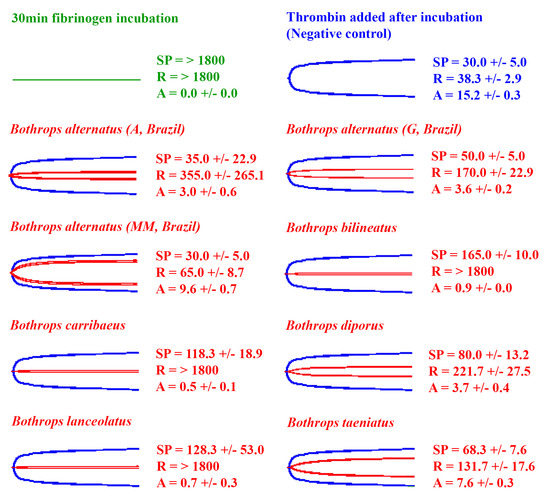 The eight venoms that did not induce a measurable clot on fibrinogen (A = 0, R = > 1800, flatline on TEG trace) (Figure 3 and Figure 4) were further tested for their ability to cleave fibrinogen in a non-clotting, destructive manner (Figure 5). This was undertaken using the Claussian method [76], whereby after the incubation of venom with fibrinogen, a vast excess of thrombin was added. Any increase in clotting time or decrease in clot strength observed is due to a depletion of fibrinogen levels.