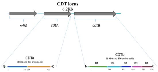 CDT comprises two regions, CDTa (48 kDa in size) and CDTb (99 kDa). CDTa is divided into two domains: the N-terminal part (residues 1 to 215), which interacts with CDTb, and the C-terminal part (residues 224 to 420), which catalyzes the ADP-ribosylation of actin [11,12,17]. CDTa comprises 463 amino acids and has a mass of ~53 kDa; the first 43 amino acids are cleaved by proteolysis, leaving a CDTa protein with a mass of ~48 kDa (Figure 1) [17]. CDTb comprises 876 amino acids and four conserved domains: D1 formed by 295 residues (at the N-terminus), D2 formed by amino acids 296 to 511, D3 formed by residues 512 to 615, and D4 formed by residues 761 to 876. These domains are involved in activation (D1, after proteolytic cleavage of a ~20 kDa fragment at the N-terminus), pore formation and membrane insertion (D2), oligomerization (D3), and receptor binding (D4). A fifth domain recently described is called D3′ (residues 616 to 744), and it is contained between D3 and D4; this domain is thought to encode for a galactose binding site [18].
