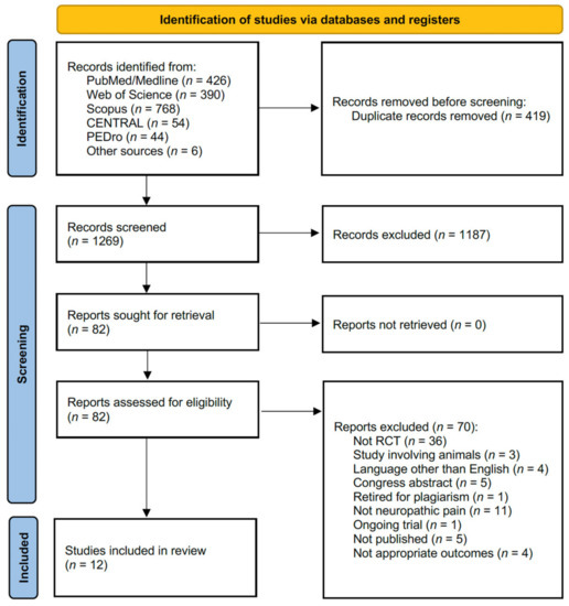 The search strategy performed on 4 April 2022 identified 1688 records from the five databases and six records from the reference lists of the included studies. Figure 1 shows the PRISMA flow diagram of the search process. After duplication removal, 1269 studies were assessed for eligibility and screened for title and abstract. After the exclusion of 1187 records, 82 full-text records were assessed for eligibility. Due to inconsistency with the eligibility criteria, 70 articles were excluded (36 were not RCTs, 3 studies involved animals, 4 were in a language other than English, 1 was retired for plagiarism, 11 did not assess patients with neuropathic pain, 1 was an ongoing trial, 5 were congress abstracts, 5 were registered protocols not published, and 4 did not assess appropriate outcomes). The Supplementary Table S2 shows the lists of excluded studies assessed in full text and the reasons for exclusions. As a result, 12 studies were included in the present work [26,36,37,38,39,40,41,42,43,44,45,46]. The studies included in this systematic review were published between 2006 [46] and 2020 [43]. Among these, two studies were conducted in the USA [37,46]; three studies were conducted in Iran [39,42,43]; one study was conducted in Taiwan [45]; one was conducted in Greece [36]; one was conducted in Canada [38]; one was conducted in South Korea [40]; one was conducted in France [41]; and one was conducted in China [44]. The remaining study was an international collaboration (France and Brazil, n = 1 [26]).
