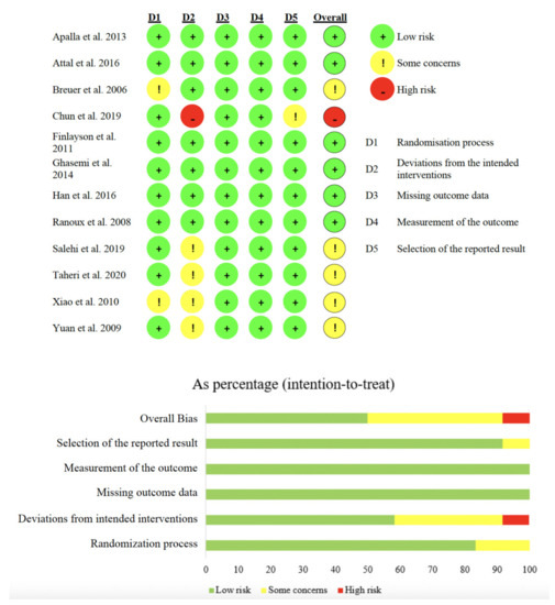 The risk of bias was assessed by the Cochrane risk-of-bias tool for randomized trials (RoBv.2) [48]. Bias was classified as low, high, or unclear based on the item of RoBv.2. In particular, the domains assessed by RoBv.2 were: (i) random process; (ii) deviation from the intended interventions; (iii) missing outcome data; (iv) measurement of the outcome; and (v) selection of the reported result.