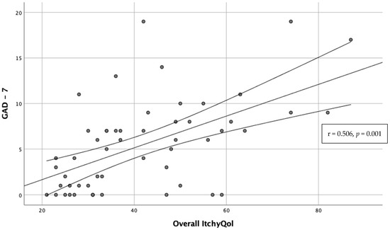 The intensity of itch according to NRS correlated positively with GAD-7 total score (r = 0.317, p = 0.019). Moreover, a strong positive correlation was observed for ItchyQoL total score and GAD-7 score (r = 0.561, p < 0.001), and 6ISS (r = 0.506, p = 0.001) (Figure 1).