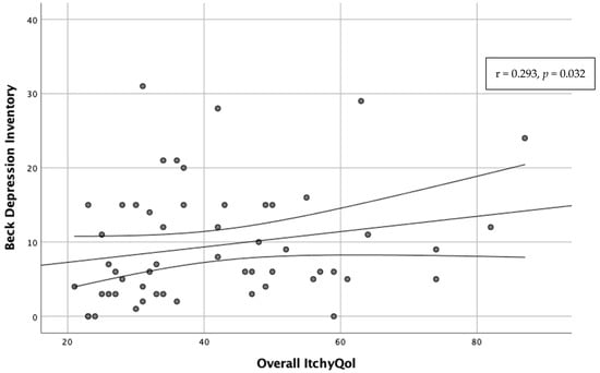 Furthermore, the ItchyQoL total score presented a moderate, positive correlation with BDI (r = 0.293, p = 0.032) (Figure 2) and HADS total score (r = 0.302, p < 0.001).