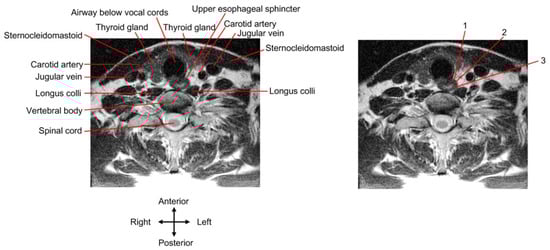 Transcutaneous injection approach. A cervical spine magnetic resonance image (MRI) of a young, healthy individual is presented. The UES slightly deviates from the midline to the left. The MRI of the (right) panel is the same as the (left) one and demonstrates three injection approaches as follows: 1, the needle route passes through the thyroid gland; 2 and 3, the needle route passes through the lateral side of the neck to bypass the thyroid gland and big blood vessels.