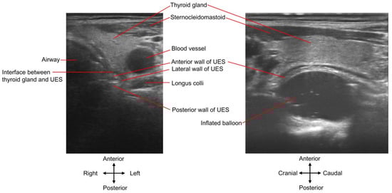 The balloon is blocked at the caudal end of UES dysfunction [42,83], which can be visualized via ultrasonography (Figure 5). This is the unique merit of the procedure because the entire narrowed segment of the UES can be determined in such a manner. A barium swallow test or manometry can hardly achieve this goal. In a barium swallow study, incomplete or failure of UES opening occurred in the cranial/upper border of the narrowed UES. However, a clear caudal/lower border of UES dysfunction may not be seen via a barium test under some conditions, such as in UES opening deficits without a cricopharyngeal bar [37] or complete UES closure during swallowing. The high-pressure zone presented in a manometry test can be regarded as the length of the UES, but the relationship between the anatomical structures and the high-pressure zone may be inconsistent [37], because the spatial relation between the cricopharyngeal muscle and manometric sensors during swallowing is changing caused by laryngeal elevation [68]. Additionally, for a balloon catheter application combined with ultrasonography, the blocked inflated balloon can be visualized in real-time to guide the needle insertion towards the wall of the narrowed UES [80,81], and this process cannot be achieved by manometry, CT, or a barium study.