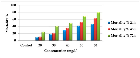 The toxicological activity of AcF extract was tested at different concentrations (60, 50, 40, 30, and 20 mg/L). The mortality percentages increased gradually according to concentration and time gradients as follows: 47.37%, 63.9%, and 80.56% during 24, 48, and 72 h, respectively, for 60 mg/L. For 50 mg/L, the mortality was 42.11%, 52.78%, and 69.44% during 24, 48, and 72 h, respectively. At 40 mg/L, the results were 28.95%, 36.11%, and 50% for 24, 48, and 72 h, respectively. Moreover, 30 mg/L recorded 18.42%, 22.22%, and 41.67%. Finally, 20 mg/L showed 10.53%, 11.11%, and 25% for 24, 48, and 72 h, respectively (Figure 1). All the data were compared with the control group for all concentrations, which had no changes during the experiment.