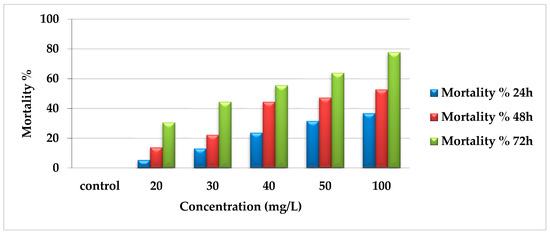 The insecticidal effect of EtF extract reflected that the percentage of mortality was directly proportioned with concentration and time. After 24 h, mortality was 36.8%, 31.58%, 23.7%, 13.16%, and 5.3% for concentrations 100, 50, 40, 30, and 20 mg/L, respectively compared with zero percent in the control. There was a gradual increase in mortality after 48 h (52.78%, 47.22%, 44.44%, 22.22%, and 13.9%) for previously mentioned concentrations, respectively. In addition, after 72 h, the mortality percentage reached the maximum, especially with the higher concentrations (100, 50, and 40 mg/L) as 77.78%, 63.9%, and 55.56% and 44.44% and 30.56% with 30 and 20 mg/L as presented in Figure 2.
