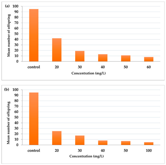 AcF extract reduced the fecundity of aphid adults more than EtF extract (Figure 3). AcF recorded the highest effect at 60 mg/L (number of offspring was 8) and 11, 13, 19, and 42 offspring for 50, 40, 30, and 20 mg/L, respectively, compared with 92 offspring in the control (Figure 3a). On the other hand, EtF extract at the highest concentration (100 mg/L) reduced the fecundity to 5 offspring then 7, 8, 17, and 25 offspring for 50, 40, 30, and 20 mg/L, respectively, compared with 95 offspring in the control (Figure 3b).