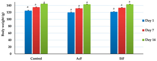 Overall body weight increased with time in all groups, but there was no difference between the control and treatment groups (AcF and EtF) at any time point (14 days) (p > 0.05) (Figure 4). On day 1, weights were recorded as 120, 121.67 ± 1.67, and 125 g, respectively. On day 7, weights were 131.67 ± 1.67, 133.33 ± 1.67, and 135 ± 2.89 g, respectively. Whereas, on day 14, weights elevated to 143.33 ± 1.67, 143.33 ± 1.67, and 145 ± 2.89 g, respectively (p < 0.05).