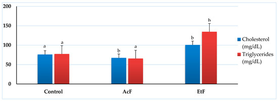 2.7.2. Effect of LC50 of AcF and EtF Extracts on Total Cholesterol and Triglycerides
