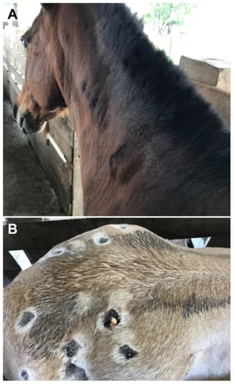 Antivenom remains the only effective treatment against this envenomation [,]. Horses are the most used species for antivenom production around the world. One of the obstacles for antivenom production is the welfare of horses submitted to immunization protocols [,]. In fact, the crude venoms used in the immunization protocols do not undergo any detoxification process, thus assuring that no structural or epitopic modification occurs that can alter its immunogenic capacity []. However, little is known about the consequences of the systematic use of the Loxosceles venom and adjuvants and of the blood collections on antivenom-producing horses. Thus, the aim of this study was to evaluate the clinical changes in horses in their first immunization protocol for Loxosceles antivenom production.