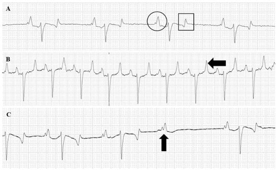 Electrocardiogram (ECG). (A) Normal sinus rhythm ECG from a horse before immunization. Common findings in ECG recordings were bifid P (circle) wave and biphasic T wave (square). (B) Sinus tachycardia from a horse after first bleeding. An increase in T wave was also observed (arrow). (C) Second-degree atrioventricular block from a horse after first bleeding. P wave (arrow) with no following QRS complex is observed.