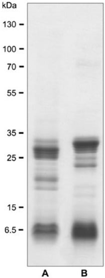SDS-polyacrylamide gel (12.5%) electrophoretic separation of L. intermedia venom used in the study. (A) A non-reduced sample and (B) a reduced sample. Numbers on the left correspond to the positions of molecular weight markers (in kDa).