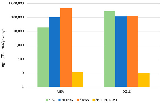 Fungal contamination in indoor sites was 1.00 × 105 CFU·m−2 on MEA and 1.15 × 105 CFU·m−2 on DG18 in filter samples; 4.40 × 105 CFU·m−2 on MEA and 1.30 × 105 CFU·m−2 on DG18 in floor surface swabs and 1.90 × 104 CFU·m−2 in MEA and 2.70 × 105 CFU·m−2 in DG18 in EDC samples. Settled dust had the highest fungal contamination, ranging from 1.15 × 101 CFU·m−2 on MEA and 1.00 × 101 CFU·m−2 on DG18 (Figure 1).