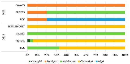 Regarding Aspergillus sp., the highest value of the genera was obtained in DG18 (18.38%) comparatively with MEA (4.11%). In DG18, the most contaminated matrixes with Aspergillus sp. were filter samples (27.71%). The genus was also present in surface swab samples (23.08%), EDC (11.25%), and settled dust (25.00%). On MEA, the matrices with the highest values of the genera were surface swab samples (4.55%), followed by EDC (2.79%) and filters (2.50%). The genus was not identified in settled dust samples (Figure 2).