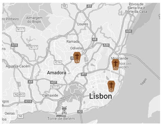 This study sampling campaign was conducted between May and June 2021 in three cemeteries located in Lisbon (Figure 3). There were 41 workers in Cemetery 1 (G1), 22 in Cemetery 2 (G2), and 13 in Cemetery 3 (G3), and all worked in regular 8-h shifts. In G1 there were 1 cemetery coordinator, 1 foreman, 7 administrative workers, 18 gravediggers, 8 gravediggers from the crematorium, 4 drivers of heavy machinery and special vehicles, 1 paver, and 1 locksmith. In G2 there were 1 cemetery coordinator, 1 foreman, 5 administrative workers, 5 gravediggers, 8 gravediggers from the crematorium, and 2 auxiliary workers. In G3 there were 1 cemetery coordinator, 1 foreman, 3 administrative workers, 5 gravediggers, 2 auxiliary workers and 1 concierge, accounting for a total of 76 workers in all the assessed cemeteries. The sampling sites were the Administrative service, Repository room, Crematory, Bar, Kitchen, Canteen (tables and Self-Service area), male and female locker room, and drivers’ and gravediggers’ locker room.