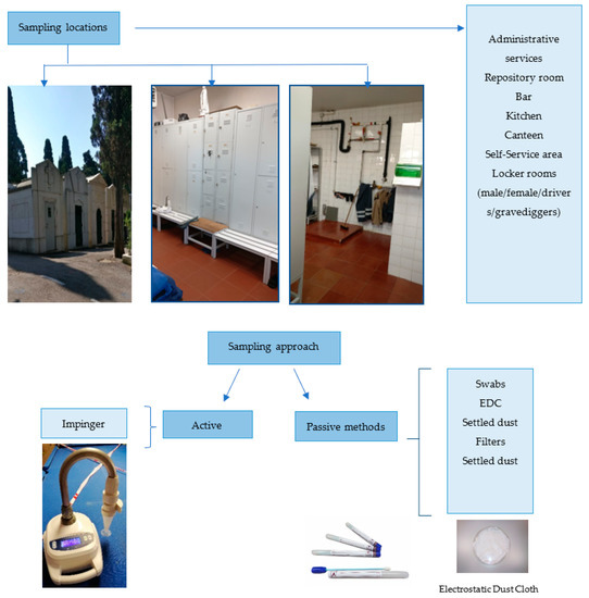 A multi-sampling approach protocol was performed by using active and passive sampling methods and through normal working days (Figure 2). An impinger device—Coriolis μ air sampler (Bertin Technologies, Montigny-le-Bretonneux, France)—was employed for SARS-CoV-2 detection. The passive sampling methods used in the implemented sampling campaign were settled dust, surfaces swabs and electrostatic dust cloths (EDC) (Figure 4).