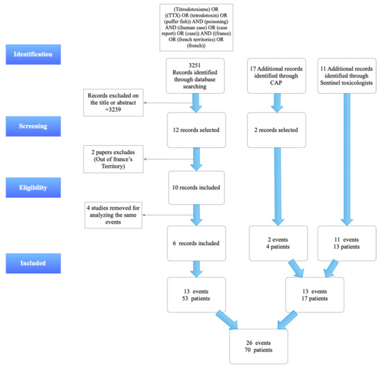 The articles were searched using the following databases: MedLine, Scopus and Google Scholar, using the following keywords: (Tetrodotoxism) OR ((TTX) OR (tetrodotoxin) OR (puffer fish)) AND (poisoning) AND ((human case) OR (case report) OR (case)) AND ((france) OR (french territories) OR (french)).