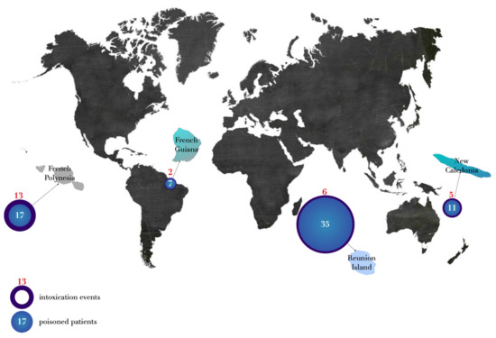 Two events involved seven patients occurred in French Guyana; five in New Caledonia with 11 patients; six in Reunion island with 35 patients; 13 in French Polynesia including 17 patients (Figure 2). To date, no acute TTX poisoning has been reported in mainland France and French West Indies (Guadeloupe and Martinique) (Figure 2).