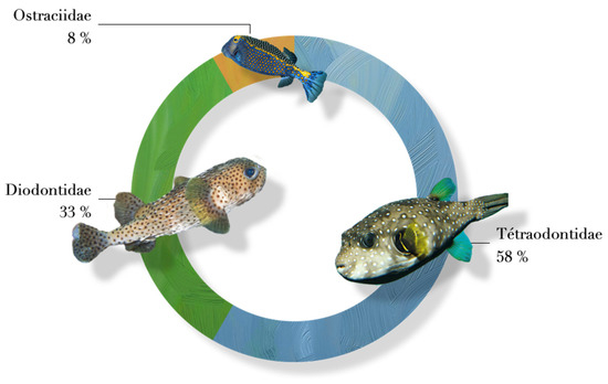 The fish origin was only provided for five poisonings; four personal fisheries, and one secondary to purchase from a non-professional fisherman. Of the 26 poisonings, 24 events described the animal responsible for the poisoning. All of the TTX poisonings followed the intake of a fish from the Tetraodontiform order. Among this order, three families are responsible for all the poisonings (Figure 4): the Tetraodontidae (n = 14, 58%), the Diodondidae (n = 8, 33.3%) and the Ostraciidae (n = 2, 8%). Among the Tetraodontoidae family, four observations were found involving a fish from the Arothron genus with the A. nigropunctatus, A. meleagris and A. hispidus species, two observations implied a fish from the Canthigaster genus with the C. solandri species, three observations implied a fish from the Lagocephalus genus with the L. sceleratus species and finally, one observation implied a fish from the Sphoeroides genus with the S. testudineus species.