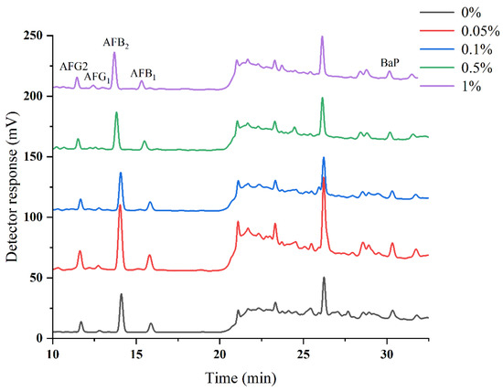 The molecular diversity and lipophilicity characteristics of the investigated compounds play an important role during HPLC analysis. The lipophilicity of the analytes with log p values ranged from 1.63 to 6.39; thus, the mobile phase mainly consisted of organic solvent and water under neutral or acidic conditions. A mobile-phase system consisting of methanol–aqueous formic acid was selected to achieve good separation with acceptable sensitivity of the FLD detector. Moreover, methanol has lower toxicity than acetonitrile. As shown in Figure 1, the HPLC chromatographic peaks of AFB1 and BaP increased dramatically as the content of formic acid increased from 0% to 0.05%, and the peaks gradually decreased as the content of formic acid increased continuously from 0.05% to 1%. Therefore, methanol and aqueous 0.05% formic acid were employed as the mobile phase in the following gradient elution procedure.