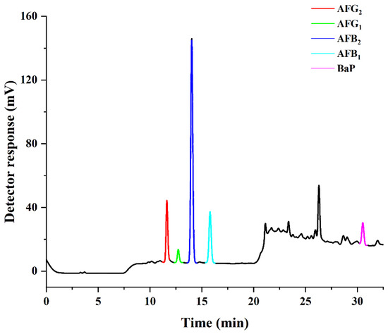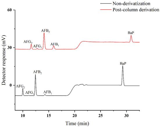 In previous works on HPLC–FLD detection, excitation and emission wavelengths (λex/λem) for AFs and BaP were 360/440 and 384/406 nm, respectively. Due to variation in molecular structures and chemical properties, excitation and emission wavelengths, as well as fluorescence spectra of AFs and BaP, should be further improved. Specifically, the requirement of an online post-column photolysis PHRED system for AFs should be reconsidered. As depicted in Figure 2, post-column derivatization prolongs the overall analysis times. However, it significantly increased the response value of AFB1 and AFG1 and only slightly reduced the response of BaP in an acceptable range. Under the wavelengths of λex/λem at 380/420 nm, high sensitivity and baseline separation were achieved for AFB1, AFB2, AFG1, AFG2, and BaP in approximately 30 min, without interference.
