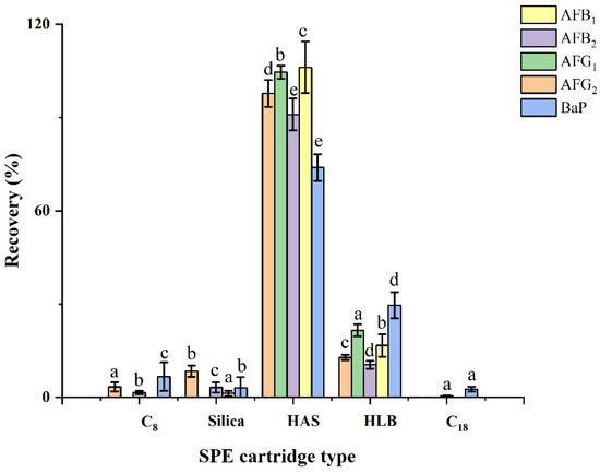 Effect of the types of SPE adsorbents on the recoveries of AFs and BaP. Data were analyzed using one-way ANOVA with Duncan’s multiple range test, and classified as group a, b, c, d and e.