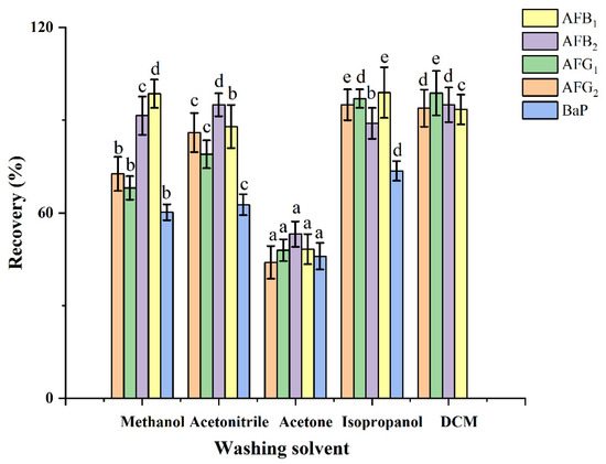 Effect of washing solvent on the recoveries of AFs and BaP. Data were analyzed using one-way ANOVA with Duncan’s multiple range test, and classified as group a, b, c, d and e.