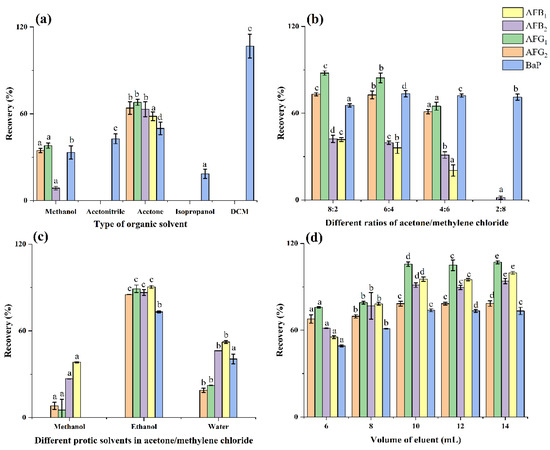 Optimization of eluting solvent: (a) type of organic solvent; (b) different ratios of acetone/methylene chloride; (c) different protic solvents in acetone/methylene chloride; (d) volume of eluent. The blank soybean oils were spiked with AFs and BaP at 5 μg kg−1. Data were analyzed using one-way ANOVA with Duncan’s multiple range test, and classified as group a, b, c, d and e.