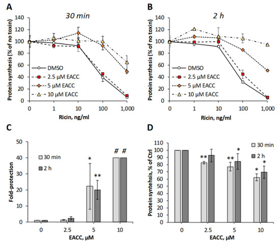 EACC protected HEp-2 cells against ricin. HEp-2 cells were treated with EACC for 30 min (A) or 2 h (B) and subsequently incubated with increasing concentrations of ricin for 3 h, before protein synthesis was measured. Representative experiments are shown (A,B). (C) Fold protection was calculated as an increase in IC50 in EACC-treated samples compared to control (DMSO-treated cells). #: At 10 µM dose, cells were fully protected against ricin (for up to 1000 ng/mL) and protection could not be calculated. (D) Protein synthesis in the cells treated with EACC for 3.5 h (30 min + 3 h when the toxin was added to other wells) or 5 h (2 h + 3 h when toxin was added to other wells). n ≥ 3; * p ≤ 0.05, ** p ≤ 0.005.