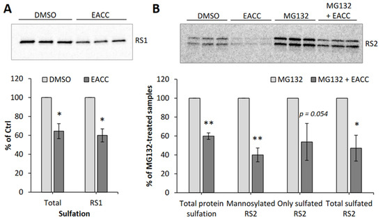 Effect of EACC on sulfation of ricin and endogenous proteins. (A) HeLa cells were treated with 0.1% DMSO or 5 µM EACC for 2 h and then were subjected to sulfation assay with ricin-sulf1 (RS1). The upper figure shows an autoradiogram of one representative experiment, and the lower figure shows the quantification of total protein sulfation and RS1 sulfation expressed as percent of control (DMSO); n = 3. (B) HEp-2 cells were treated with 0.1% DMSO or 5 µM EACC for 2 h and then were subjected to sulfation assay with ricin-sulf2 (RS2). To half of the wells, proteasome inhibitor MG132 (10 μM) was added together with RS2. The upper figure shows an autoradiogram of one representative experiment, and the lower figure shows the quantification of RS2 sulfation and mannosylation expressed as percent of MG132 treated cells; n = 3. Only sulfated RS2 is the lower band. When the sulfated RS2 was also mannosylated, it moved more slowly; that is the upper band, and the columns called total sulfated RS2 are the sum of the two bands. In all these experiments, the cells were incubated for 1 h with 35SO42− before addition of inhibitors. After addition of the ricin constructs, the incubation was continued for 3 h before removal of surface-bound toxin, lysis, immunoprecipitation, electrophoresis, Western blotting, and quantification of the radioactive bands; * p ≤ 0.05, ** p ≤ 0.005.