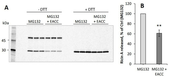 Release of ricin A-chain after EACC treatment. HEp-2 cells were incubated for 1 h with 35SO42− and then EACC was added to some of the cells (5 μM), and the incubation was continued for 2 h more before further addition of RS1 and MG132 (10 µM) to all the cells. After 3 h of additional incubation, N-ethylmaleimide (1 mM) was added to prevent further reduction of RS1, and surface-bound toxin was removed with lactose. Then the cells were lysed, and an anti-ricin A-chain antibody was used for immunoprecipation. The precipitates were then washed twice with PBS containing TritonX-100 (0.35%), resuspended in Laemmli sample buffer with and without 100 mM DTT, and boiled for 5 min before being run on SDS-PAGE. Further processing and quantification were performed as described in Materials and Methods. In (A) is shown one representative example of such an experiment where the samples to the left were run on a non-reducing gel (−DTT) and the samples to the right on a reducing gel (+DTT). (B) shows quantification of the release of A-chain from independent experiments (n = 3); ** p ≤ 0.005.