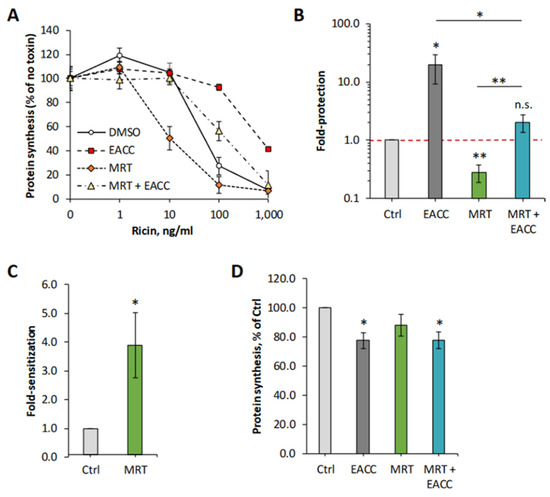 MRT68601 strongly sensitized cells to ricin, an effect counteracted by EACC. HEp-2 cells were treated with 25 µM MRT68601 or DMSO (0.1%) for 30 min prior to addition of 5 µM EACC or DMSO. Following additional 2 h incubation with the inhibitors, the cells were incubated with increasing concentrations of ricin for 3 h, before protein synthesis was measured. One representative experiment is shown in (A). (B) Fold protection was calculated as an increase in IC50 in EACC-treated samples compared to control (DMSO-treated cells). (C) Fold sensitization was calculated for the samples treated with MRT alone. (D) Protein synthesis in the cells treated with the inhibitors for 5.5 h (2.5 h + 3 h when the toxin was added to other wells). n = 4. Protection by EACC and sensitization by MRT68601 were significant compared to DMSO, while the combination of the two was not significantly different from the DMSO; * p ≤ 0.05, ** p ≤ 0.005.