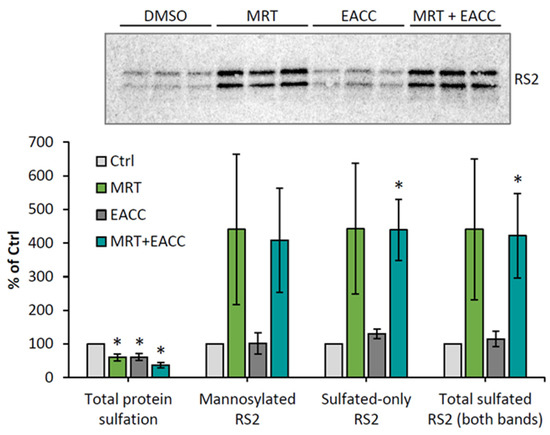 MRT68601 increased ricin transport to Golgi and ER also when combined with EACC. HEp-2 cells were first incubated for 30 min with 35SO42− and then the cells were treated with 25 µM MRT68601 or 0.1% DMSO for 30 min prior to addition of 5 µM EACC or 0.1% DMSO. After further incubation for 2 h, ricin-sulf2 (RS2) was added and the incubation was continued for 3 h more before removal of surface-bound toxin, lysis of the cells, immunoprecipitation of the toxin, and further processing as described earlier. The upper figure shows an autoradiogram of one representative experiment, and the lower figure shows the quantification of RS2 sulfation and mannosylation expressed as percent of DMSO-treated cells, n = 3; * p ≤ 0.05.