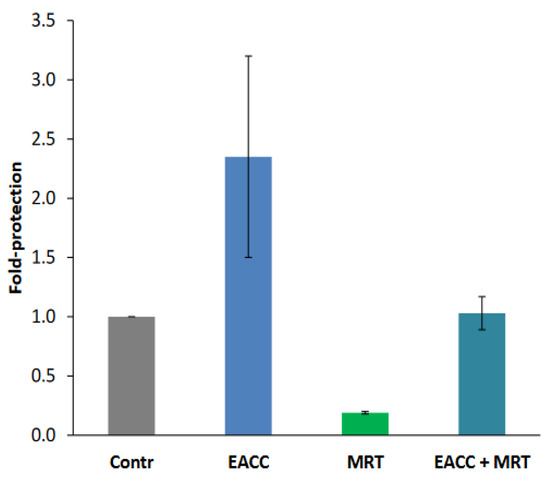 EACC protected and MRT68601 sensitized to Shiga toxin. HEp-2 cells were washed once with HEPES-buffered medium and then treated with 25 µM MRT or 0.1% DMSO for 30 min at 37 °C. Then, 5 µM EACC or DMSO (0.1%) was added and the incubation was continued for 2 h. Finally, the cells were incubated with increasing concentrations of Shiga toxin for 4 h, before protein synthesis was measured. Fold protection was calculated as fold change in IC50 in the inhibitor-treated samples compared to control (Ctrl; DMSO-treated cells). n = 2.