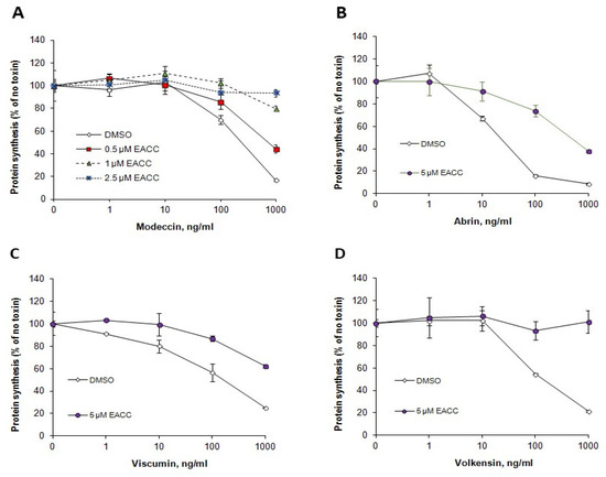 EACC protected against modeccin (A), abrin (B), viscumin (C), and volkensin (D). HEp-2 cells were treated with or without EACC for 2 h, and then incubated with the indicated concentrations of the various toxins for 3 h. The error bars show deviations between duplicates in a representative experiment. n = 3.