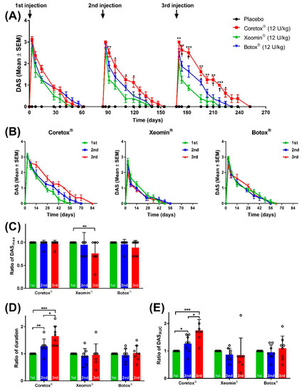 Figure 1A presents the course of paretic effects on the ipsilateral hind limb following three repeated IM injections of Botox®, Xeomin®, and Coretox® (12 U/kg per dose). Considering all three BoNT/A formulations, peak DAS values were observed three days after each repeated injection, followed by a steady decline over time. At the start of the next dosing cycle, all animals had reached full recovery (DAS = 0). Compared with the other two BoNT/A formulations, the duration of paretic effects of Coretox® increased after successive repeated doses (Figure 1A,B). Changes in the level of local paretic effects induced by the first, second, and third IM injections with each BoNT/A formulation were evaluated by comparing the average ratio of DASmax, DASAUC, and duration of action of the second and third dosing cycles to the first dosing cycle. Botox® and Coretox® showed no significant difference in the ratio of DASmax between the three repeated injections, whereas Xeomin® presented a significantly reduced ratio of DASmax after the third injection (Figure 1C). Both Botox® and Xeomin® showed no significant changes in the duration of action and DASAUC in all three dosing cycles. Meanwhile, Coretox® displayed a significant increase in both duration of action and DASAUC value after each successive injection (Figure 1D,E).