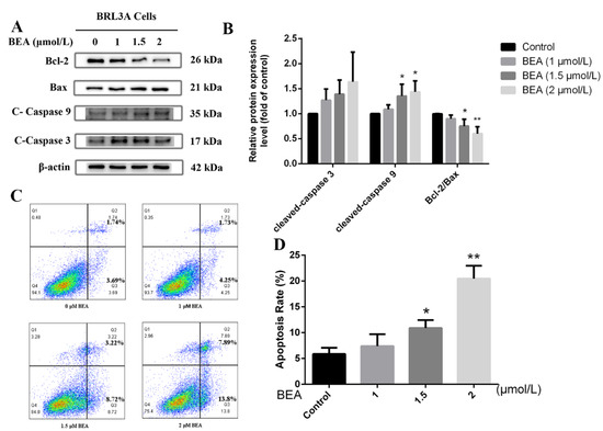 Effect of BEA exposure on apoptosis in BRL3A cells in a concentration-dependent manner. (A) Expressions of apoptosis-related proteins were detected by western blot after BEA treatment at the concentrations of 0, 1, 1.5, and 2 μmol/L for 12 h. (B) The ratio of Bcl-2/Bax, cleaved-caspase 3/β-actin, and cleaved-caspase 9/β-actin was analyzed by ImageJ, respectively. All western blot results were normalized with respect to β-actin. (C,D) Apoptosis rate of BRL3A cells after BEA exposure was determined using flow cytometry with annexin V-FITC/PI staining. All experiments were performed in triplicate (n = 3) and data were presented as the means ± SD and analyzed by one-way ANOVA. * p < 0.05 and ** p < 0.01, compared with the blank control group.