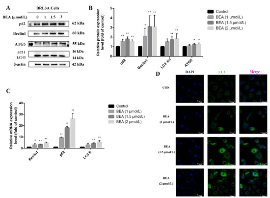 ROS production and the consequent oxidative damage has been demonstrated to be a regulator in inducing autophagy and macro-autophagy; it can, in turn, relieve the injury caused by oxidative stress via different signaling pathways. Our data revealed an increase in the mRNA and protein expression levels of autophagy-related proteins, Beclin1, ATG5, and LC3, after treatment with 1.5 and 2 μmol/L BEA for 12 h (Figure 4). Meanwhile, ATG5 protein expression also increased significantly (p < 0.05). Figure 4D showed the number of LC3 puncta increased in the cytoplasm of BRL3A cells treated with increasing BEA concentrations. The above results suggested the activation of autophagy and degradation inhibition of autophagy products.