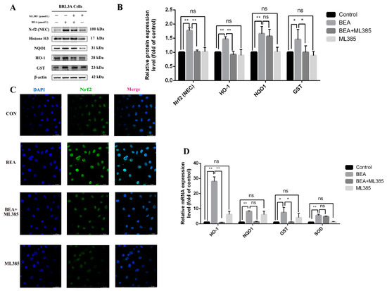 Effect of ML385 on reduced Nrf2 activation in BEA-exposed BRL3A cells. (A) The levels of Nrf2 signaling pathway-related proteins followed by treatment with 0, BEA (1.5 μmol/L), or ML385 (5 μmol/L), or BEA + ML385 for 12 h was detected using western blot. (B) ImageJ analysis of Nrf2 (nuclear), NQO1, HO-1, and GST. (C) Translocation of Nrf2 to the nucleus in BRL3A cells was observed using confocal fluorescence microscopy. BRL3A cell nucleus (blue), Nrf2 (green), scale bar = 50 μm. (D) qRT-PCR was performed to measure mRNA expression levels of GST, HO-1, NQO1, and SOD. All experiments were performed in triplicate (n = 3) and data were presented as the means ± SD and analyzed by one-way ANOVA. * p < 0.05; ** p < 0.01; ns, not significant.