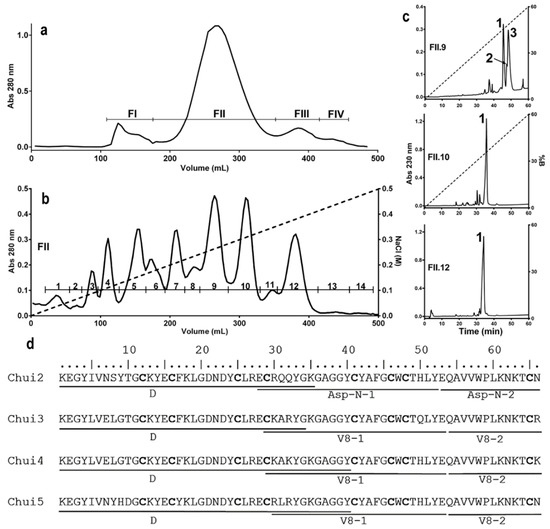 Characterization of the toxic components of C. huichol venom. A sample corresponding to 107 mg of protein from fresh venom of the C. huichol scorpion was processed to purify the toxic components. (a) Molecular exclusion chromatogram of the fresh venom. (b) Ion exchange chromatogram of the FII fraction showing 14 sub-fractions. (c) Reversed-phase chromatograms of subfractions FII.9 (Chui1, Chui2 and Chui3), FII.10 (Chui4), and FII.12 (Chui5). (d) Alignment of the sequences of Chui2, Chui3, Chui4, and Chui5 toxins showing the direct sequencing (D) of the first 34–40 amino acids and of the fragments generated by the Asp-N and V8 proteases. Cysteine residues are indicated in bold.