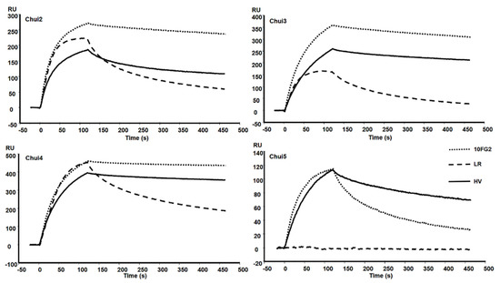 Sensorgrams of the interaction of the indicated scFvs with the toxins of C. huichol. The toxins were bound to a CM5 Chip and the interaction of the scFvs 10FG2 and HV at a concentration of 100 nM and of LR at 25 nM was evaluated. Sensorgrams were obtained at the standard temperature of 25 °C.