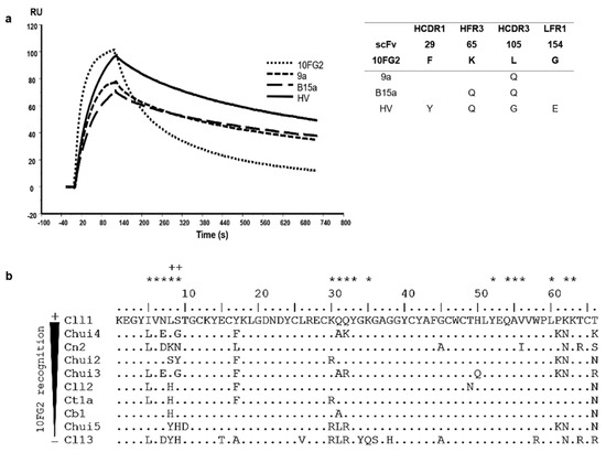 Affinity maturation cycles of scFv 10FG2 against Chui5 toxin. (a) Sensorgrams showing the interaction of scFv 10FG2 and the three variants obtained through corresponding three maturation processes at a concentration of 100 nM against Chui5 toxin. The adjacent table describes the mutations acquired by each of the variants, as well as the positions in which they are found. (b) Scorpion toxins aligned according to the level of recognition they show against scFv 10FG2. The analysis was performed evaluating the amino acid changes that the toxins present in the different reported interaction sites (asterisks) with the scFv 10FG2. In this way, positions 8 and 9 in the toxins (as well as amino acids K65 and L105 in the scFv) whose changes affect the interaction (indicated by the plus sign) were identified.