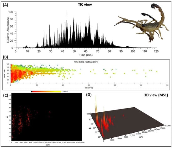 Mass profiling of Hottentotta saulcyi venom. (A) Total ion chromatogram (TIC) of the soluble venom on the C18 column under a ACN/H2O gradient elution for 120 min (using Xcalibur software); (B) heatmap of MS1 spectra, based on decolvoluted accurate mass (m/z) and scan time without intensity filtering; and (C) 2D visualization of MS1 from mass range below 30 kDa (using SeeMS software). (D) MS1 feature in 3D plot, limited to mass range <30 kDa (using Mass++ software).