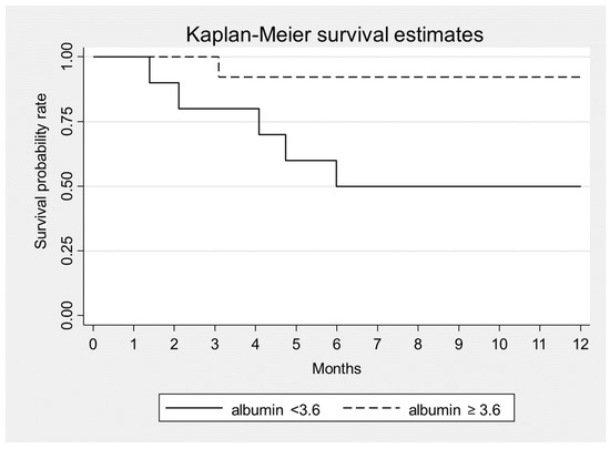 Statistical analysis showed that higher levels of albumin were significantly associated with a lower 1-year mortality (HR = 0.06, p = 0.007) (Figure 1). The other variables considered at the presentation, i.e., sex, age, serum creatinine, proteinuria, sFLC level and β2 microglobulin were unrelated with mortality (Table 5).