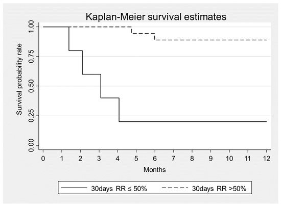 Kaplan–Meier survival estimates according to sFLC removal at Day 30 from the beginning of combined treatment, p = 0.002.