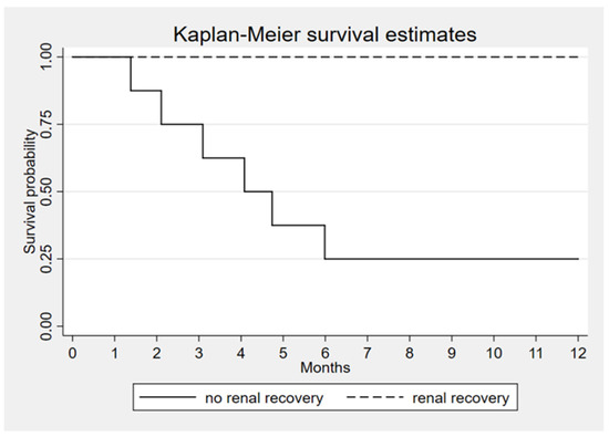 Kaplan–Meier survival estimates according to renal recovery, p < 0.001.