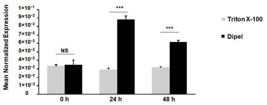 Cat L-like mRNA levels in response to a Dipel sublethal dose (2 μg/mL) determined by two-step qRT-PCR. Relative mRNA levels normalised to the reference gene GAPDH were expressed as ‘Mean Normalised Expression’ with Q-GENE. Each point represents the mean of three independent replicates ± SE. Significant differences were tested with Student’s t-test. *** p < 0.001; NS—not statistically significant.