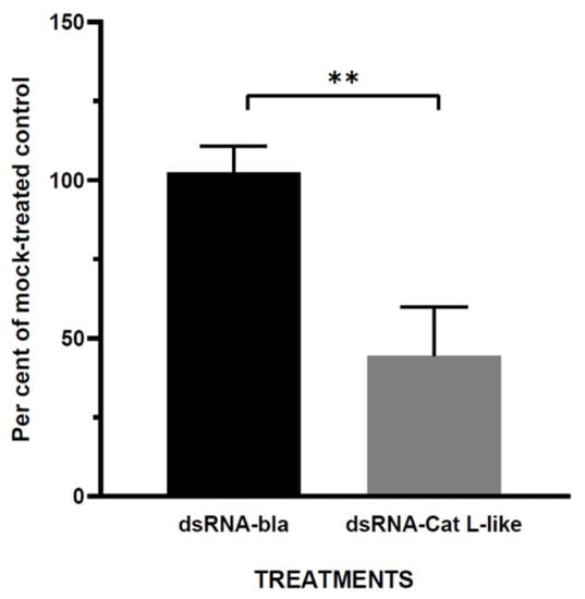 Reduction of Cat L-like mRNA transcription in haemocytes of Dipel-exposed silkworm larvae after RNAi treatment. Transcription levels of the Cat L-like gene were monitored by qRT-PCR in haemocytes from 5th instar larvae 48 h after injection of 2.5 μg dsRNA/larva of either dsRNA-Cat L-like or dsRNA-bla. Results are expressed as the per cent of mock-treated control (i.e., injected with water) after normalisation with the reference gene GAPDH. The bars represent the mean values of three independent replicates ± SE. ** p < 0.01.