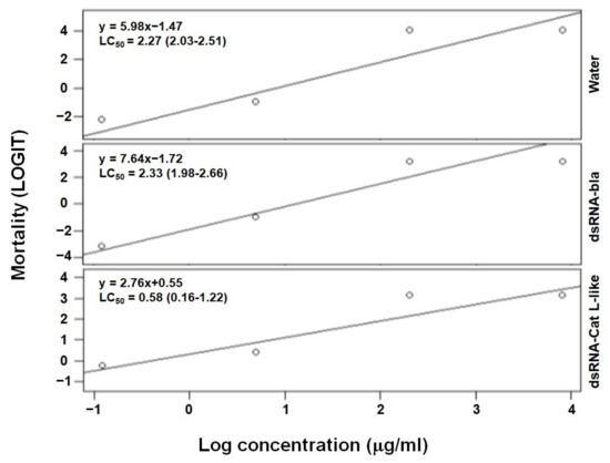 Student’s t-tests and one-way analysis of variance (ANOVA) were performed using GraphPad Prism software version 8.0.2 for Windows. The analysis of bioassays, including larval mortality in the RNAi experiments, was carried out using the open-source R environment []. Estimates of LC50, 95% Fiducial Limits, and slopes were calculated by maximum likelihood logit regression analysis in a generalized linear model from individually fitted analyses of deviance. The quasibinomial was used to adjust for overdispersion. Specific post hoc comparisons between levels within treatments were performed using model treatment contrasts. The experiments were performed three times with three independent replicates per treatment to assess reproducibility. However, the data from one representative experiment are shown. The replicates were presented as mean values ± standard error of the mean.